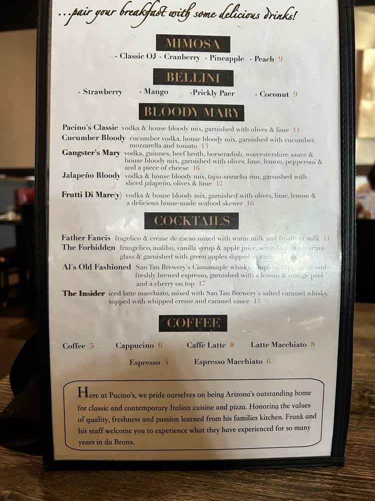 Pacino’s Restaurant, located in Mesa, Arizona, is a vibrant Italian eatery offering a wide range of dishes in a casual setting. The menu includes vegan and vegetarian options, ensuring there is something for everyone. Customers rave about the attentive service and delicious food, with standout dishes like chicken piccata, eggplant parmigiana, and a unique dolce vita pizza garnering high praise. The restaurant's ambiance, complete with Pacino memorabilia and live music, adds to the overall dining experience. With a friendly staff, a full bar, and outdoor seating available, Pacino’s is the perfect spot for a casual meal or a gathering with friends and family. Make sure to try the complimentary mini cannoli and ask to be seated in Ali's section for an exceptional dining experience. Visit Pacino’s for authentic Italian cuisine and a welcoming atmosphere that keeps customers coming back.
